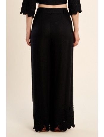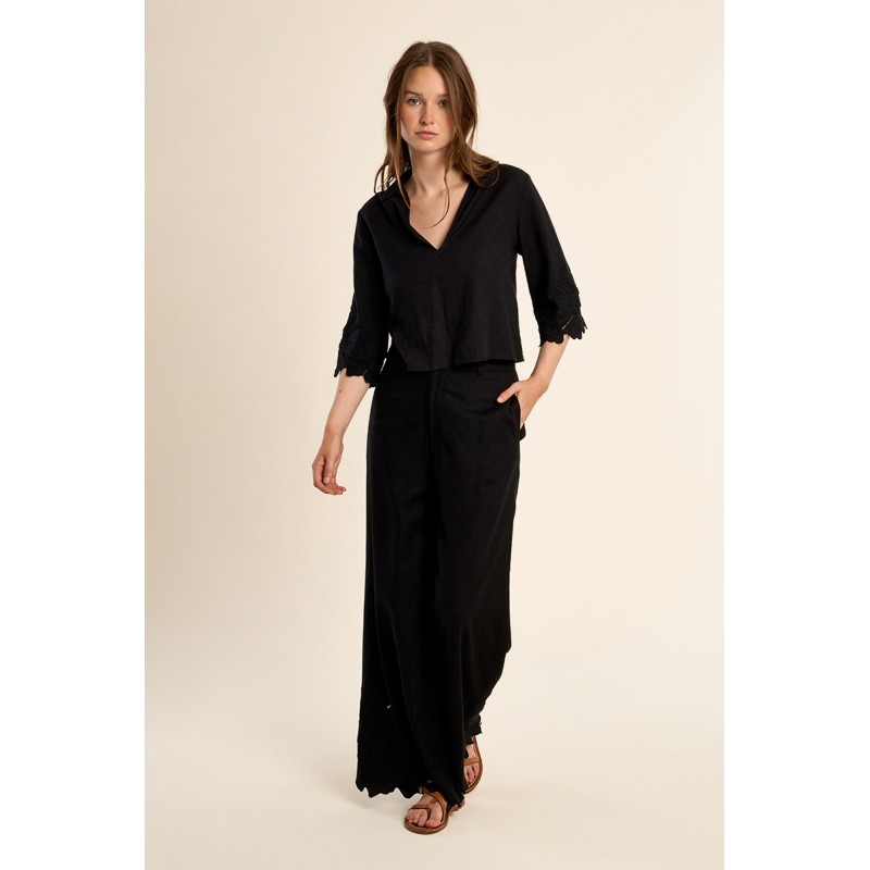 Pantalon droit, en coton -Taille haute, fermeture par bouton et zip -Poches plaquées -Finition bas en broderie ajourée